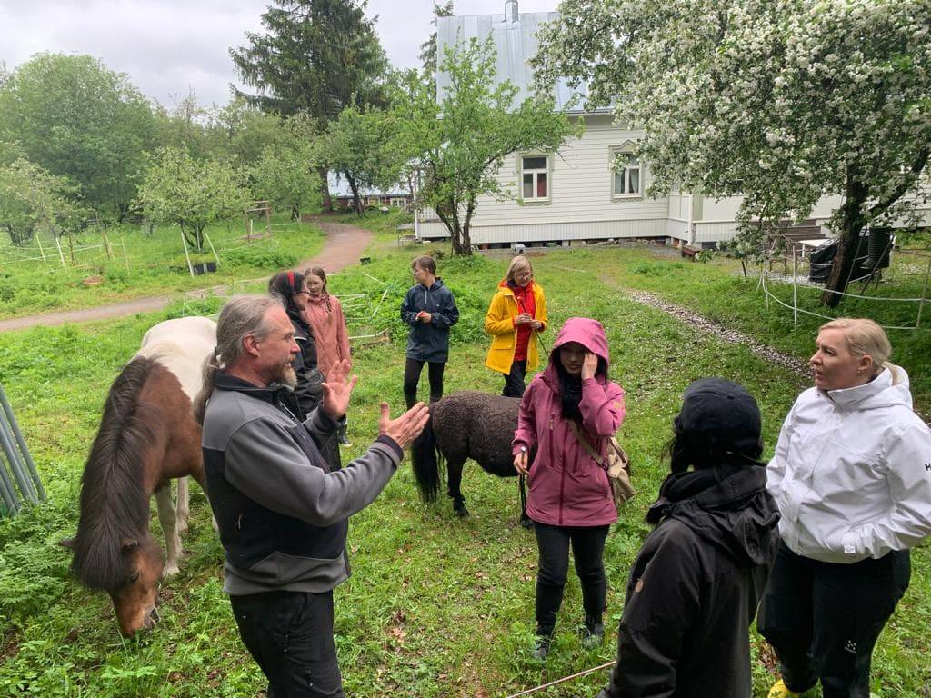 Marja-Leena, Juha’s wife, gave us a short training about interacting with the horses. It was thought-provoking to know how we can feel our bodies and know our boundaries. When the horses were brought out, they were running and playing with each other while we walked and discussed beside them. Each time the horses came closer to us, Marja-Leena gave them carrots as gifts. For many of us, it was a first time experiencing this.