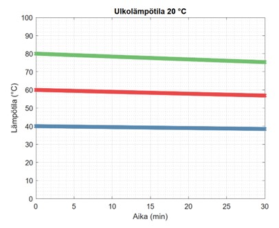 Simulaatiossa asetetaan ulkolämpötilaksi 20 celsiusastetta, ja ruokapakkausten lämpötilat ovat 40, 60 ja 80 celsiusastetta. Kuvioon 1 on piirretty lämpötilakuvaajat kaikille kolmelle ruokapakkaukselle 30 minuutin lennon aikana. Kuten voisi olettaa, mitä korkeampi alkulämpötila ruokapakkauksella on, sitä jyrkemmin lämpötila lähtee tasoittumaan kohti ulkolämpötilaa. Esimerkiksi 80 celsiusasteen ruokapakkauksella lämpötila laskee simulaation perusteella 5 celsiusastetta puolessa tunnissa, kun taas 40 celsiusasteen ruokapakkauksella lämpötila laskee vain n. 1,5 celsiusasetta. Simulaatiot vahvistavat käsitystä, että kotiinkuljetus ei saa kestää liian kauan, tai muuten ruokien lämpötila laskee liian paljon. Kahden tunnin kuljetusten aikaiset lämpötilanmuutoskuvaajat löytyvät julkaisusta.