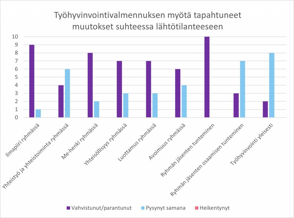 Kokonaisuudessaan valmennus vastasi asetettuihin tavoitteisiin (Kuvio 1). Valmennukseen osallistuneet oppivat tuntemaan toisiaan paremmin. Ilmapiiri, me-henki, yhteisöllisyys, avoimuus ja ryhmän jäsenten välinen luottamus paranivat. Konkreettinen yhteistyö tai toisten osaamisen tunnistaminen eivät valmennuksen aikana vielä ehtineet lisääntyä. Työhyvinvoinnin ei koettu yleisesti parantuneen, mutta sitä voi selittää myös muut yhtä aikaa työyhteisössä toteutuneet asiat.