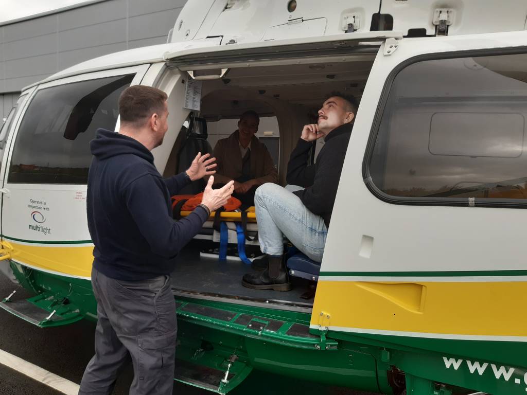 Olimme nähneet oppitunneilla videokuvaa ns. lentävästä ensihoitajasta. Videolla ensihoitaja käytti erikoispukua, jonka avulla hän pystyi siirtymään niin vuolaan joen yli kuin louhikkoisessa maastossa vuorenrinteitä ylöspäin ilmavirran avulla. Videoissa esiintyi Great North Lentopelastuksen operaatiojohtaja ja ensihoitaja Andy Mawson. Otimme häneen yhteyttä ja sovimme yhteistapaamisen Suurenglannin pohjoisen lentopelastuksen keskukseen.