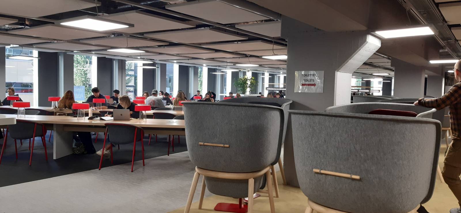 Tutustuimme konferenssin aikana Amsterdamin yliopiston kampukseen kiertämällä opiskelijoiden käyttöön suunniteltuja tiloja. Kampuksella oli runsaasti erilaisia hiljaisia opiskelutiloja, mutta myös paljon mahdollisuuksia ryhmätyöskentelyyn. Tarjolla oli monipuolisesti istuma- ja työskentelypaikkoja ja viihtyisyys oli tiloja yhdistävä teema. Itselleni uudenlainen ratkaisu oli niin sanottu videopuhelutila. Tilassa oli pöytiä, joiden yksittäiset paikat oli ympäröity akustisella kuvulla. Pöytien ääressä opiskelijat voivat osallistua etäluennoille tai -tapaamisiin päivän mittaan. Tällöin ei aiheudu ongelmaa kurssien vaihtelevista toteutustavoista, jonka moni opiskelija on sanonut hankaloittavan arkea, kun lähiopetuksen välissä pitäisi osallistua etäluennolle.