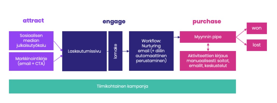 Toisena näkökulmana meillä oli moderniin myyntiin tutustuminen hyödyntäen alan viimeisintä teknologiaa ja työkaluja. HubSpot on käytössä laajasti kansainvälisissä ja suomalaisissa yrityksissä, joten sen käyttökokemus on arvokas maininta omaan ansioluetteloon. Tästä syystä työkalun käyttö tukee mielestämme aidosti opiskelijoiden valmiuksia tulevaisuuden työelämän vaatimuksiin nähden. Tämän päivän digitaaliset markkinointi- ja myyntitoimenpiteet nivoutuvat yhteen ja niiden erottaminen on entistä haastavampaa, eikä välttämättä edes tarpeellista. Sisältömarkkinointi ja markkinointiautomaatio tarjoavat B2B myyntiorganisaatioille paljon mahdollisuuksia asiakkaan ostopolun tukemiseksi. (5) Halusimme, että meiltä valmistuvat opiskelijat kehittävät työelämää ja suomalaista yrityskenttää myös tältä osin. Myyntikilpailuun tiimeille rakennettiin kuvion 1 mukainen prosessi HubSpotiin, johon integroitiin mm. prospektointityökalu Vainu, somekanavien julkaisujen ja Facebook-kampanjoiden seuranta.