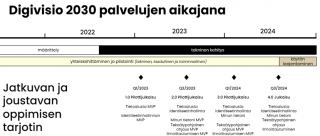 Kuva 1: Digivisio 2030 -hankeen jatkuvan ja joustavan oppimisen tarjottimen palvelujen aikajana (Lähde: Digivisio-hankkeen Eduuni-wiki)