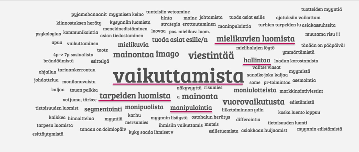 Vastaukset ovat kirjavia, mutta yhteinen nimittäjäkin löytyy helposti. Markkinointi koetaan kuluttajien manipulointina, vaikuttamisena, käyttäytymisen muuttamisena ja turhien tarpeiden luomisena. Opiskelijoiden sanavalinnoissa soi negatiivinen pohjaväre: Markkinointi on markkinointitoimenpiteiden kohdistamista objektina oleville kuluttajille. Se on jotain mitä tehdään kuluttajajoukolle, jotta se saadaan käyttäytymään yrityksen haluamalla tavalla – halusi itse kuluttajat sitä tai eivät.Uskomukset ohjaavat asenteita, asenteet ohjaavat käyttäytymistä – myös suhtautumisessa markkinointiin. Markkinointi on epäonnistunut itsensä markkinoinnissa.