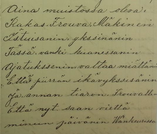 Siältä Helsingistä tuatin Tänne [Turkuun] ja nyt en pässyt Wapakssi van sain tuomijon Kuurekssi kuu kaurekssi Kyllä se on kovin raskasta ja ikävä [–] kyllä Tää vanki huone nyt muistutta ja kalva sydäntänin että niin olen ollut Tottelematoin.