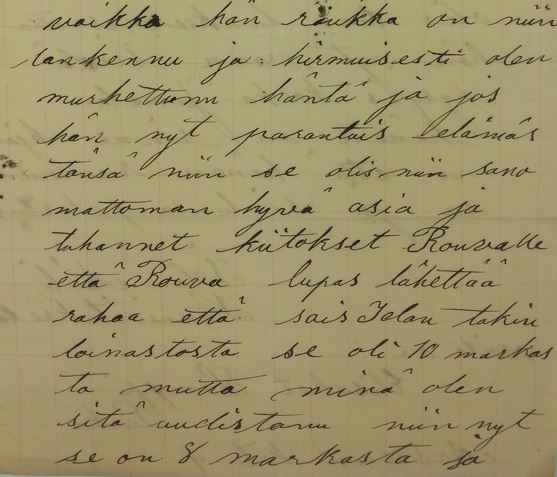 Tuhannet kiitokset Rouvalle että Rouva lupas lähettää rahaa että sais Idan takin lainastosta se oli 10 markasta mutta minä olen sitä uudistanu niin nyt se on 8 markasta ja Kyllä lappu on tallella kyllä me tahtoisimme niin Sydämestämme sen lunastaa ja lähettää mutta köyhyys on niin kova että on mahdotoin.