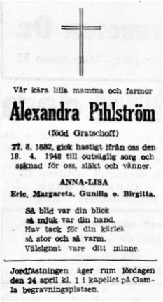 Alexandra Gratschoff ja merikapteeni Karl Evert Pihlström kihlautuivat juhannuksena 1902 ja heidät vihittiin helmikuussa 1903. Ensimmäinen lapsi, Erik Alexander, syntyi toukokuussa 1904. Toinen lapsi, Anna Elisabeth, syntyi lokakuussa 1905.