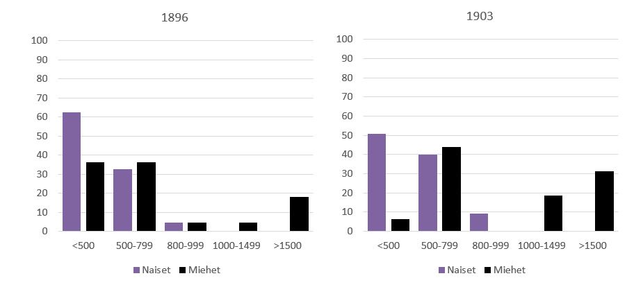 Kun ajatellaan pelkkää rahapalkkaa, naisjohtajien tilanne on samankaltainen kuin työläisnaisten: esimerkiksi 70 prosentilla ompelijattarista oli yhtä matala palkka, vähemmän kuin 500 markkaa vuodessa (Hjelt 1908, 77–78).