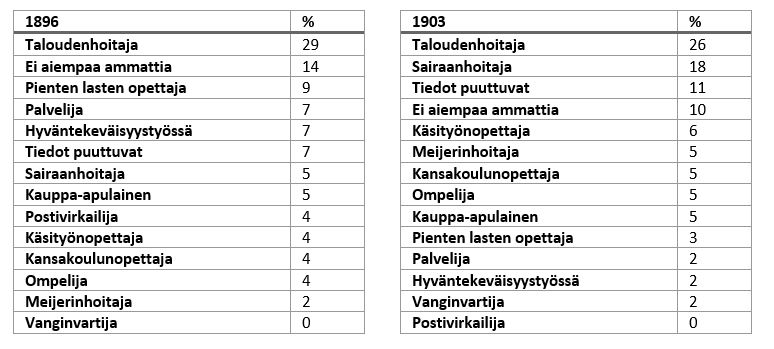 Esimerkiksi kiertokouluissa toimineiden opettajien ja muiden pienten lasten opettajien koulutus ja sosiaalinen status oli vaatimattomampi kuin kansakoulunopettajien. Palkkahaitari oli 200–500 markkaa. Näitä ”vähäisempiä” opettajia löytyykin runsain joukoin köyhäintalon johtajaksi ryhtyneiden naisten joukosta.