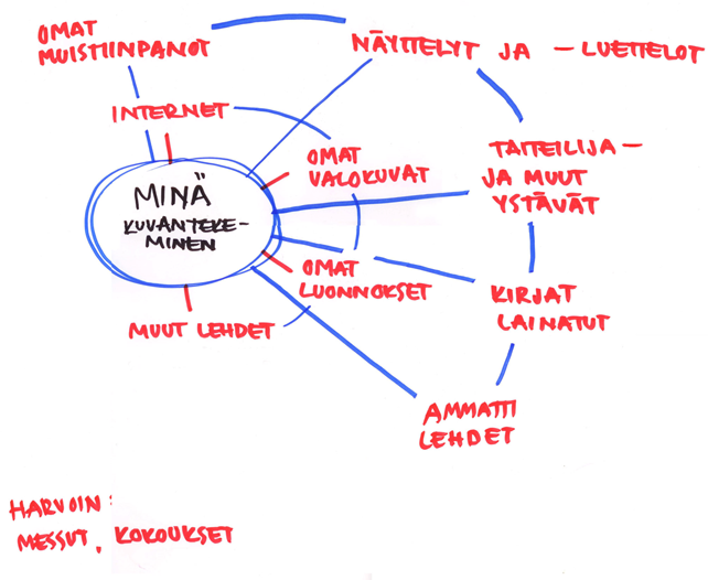 Kuvataiteilijoiden informaatiovuorovaikutuksesta tiedetään varsin vähän. Kuvassa 1 taidegraafikko kuvaa suhdettaan tiedonhankintaan oman työprosessinsa aikana. Hänelle keskeisimpiä tiedonlähteitä ja tiedonhaun kanavia ovat omat luonnokset, itse otetut valokuvat, internet sekä aikakauslehdet ja sanomalehdet. Seuraavaksi eniten hän käyttää lähteinä omia muistiinpanojaan, ammattilehtiä ja kirjoja ja saa tietoa myös taiteilijaystävien ja muiden ystävien kautta sekä taidenäyttelyistä ja näyttelyluetteloista. Taidealan messuja ja kokouksia hän ei pidä itselleen kovin merkittävinä tiedonhaun kanavina. Tutkin kuvataiteilijoiden informaatiovuorovaikutusta tekeillä olevassa väitöskirjassani.